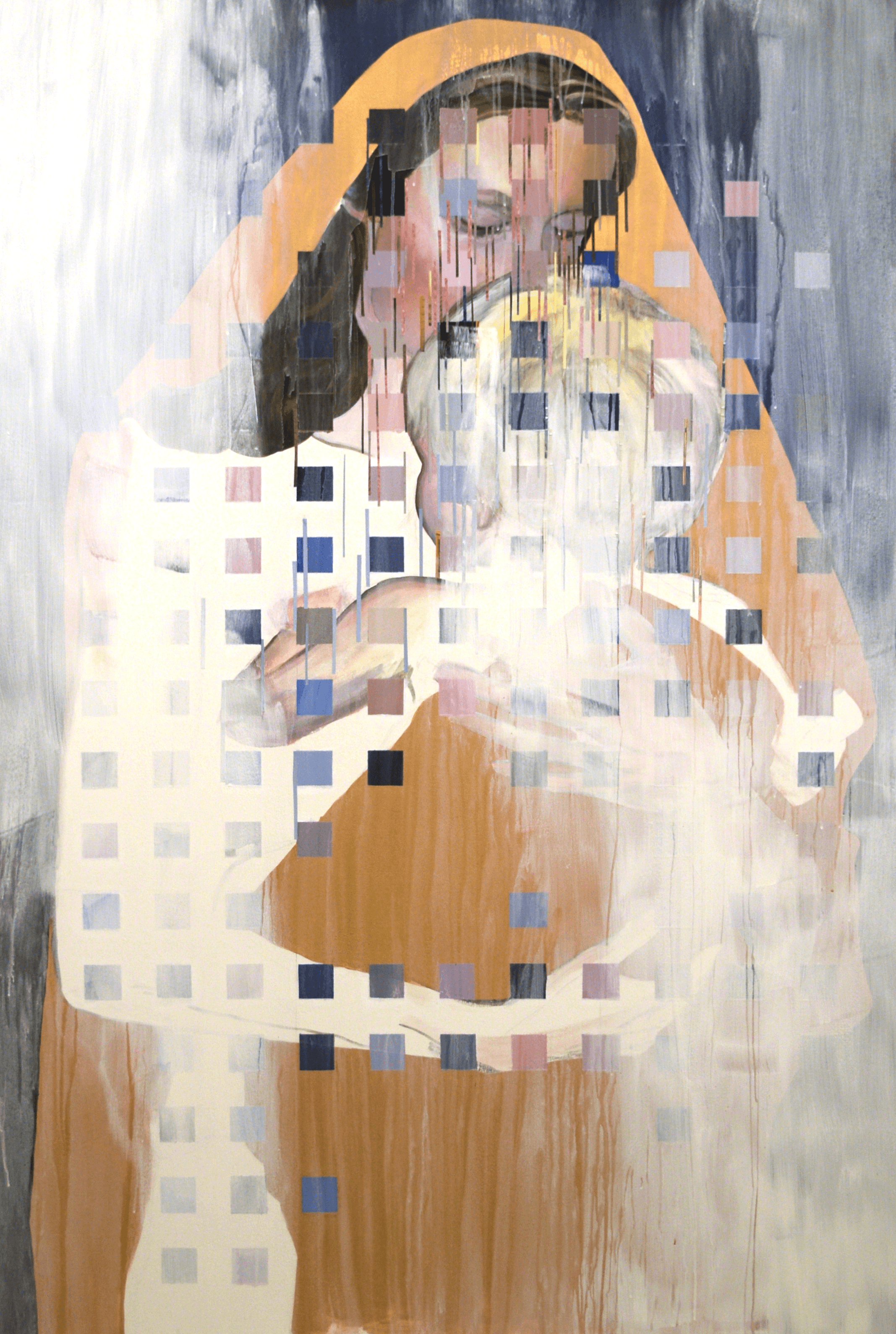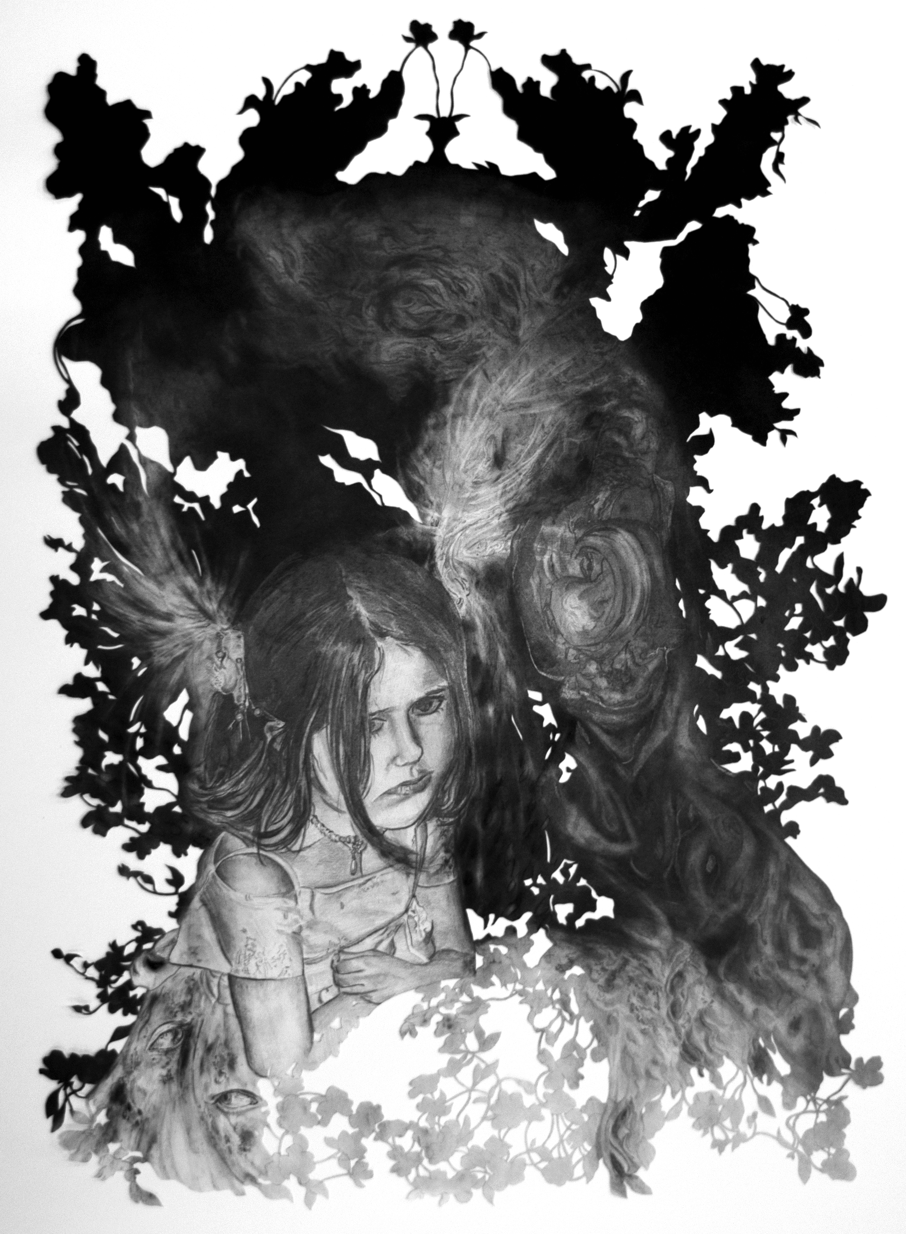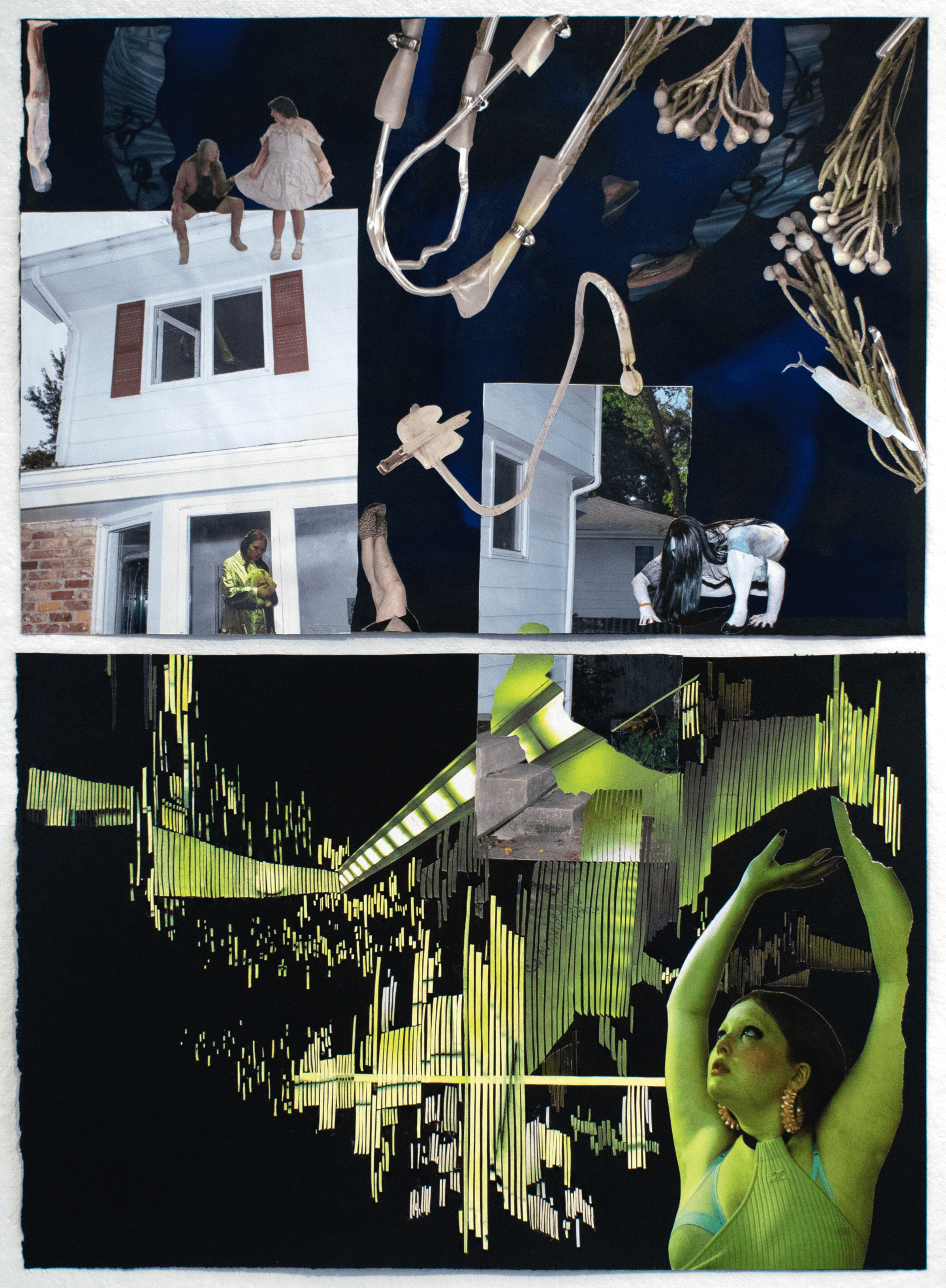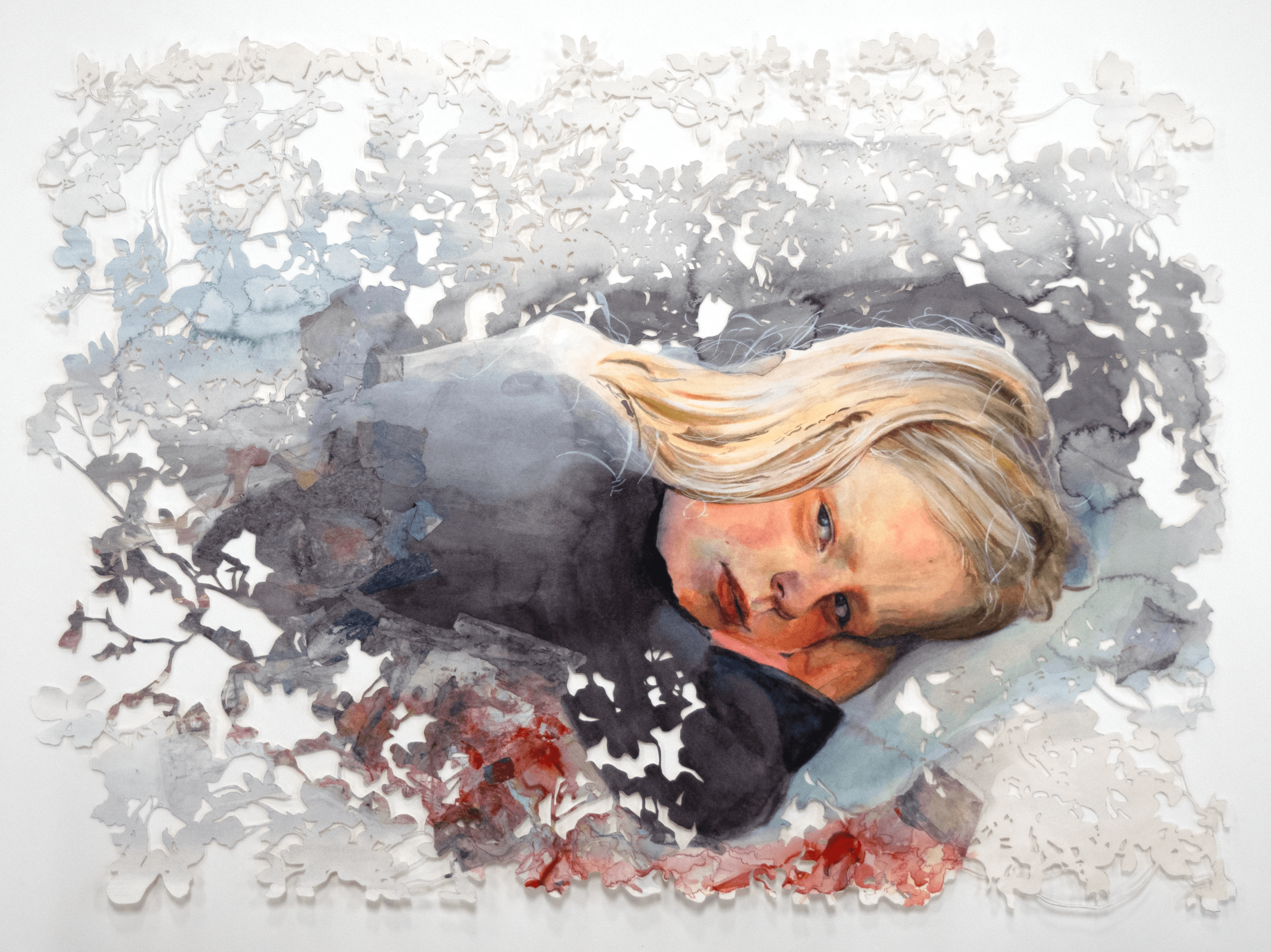 watercolour on paper, paper cutting, torn up self portrait using acrylic on tissue paper, 56 x 74 cm, 2023